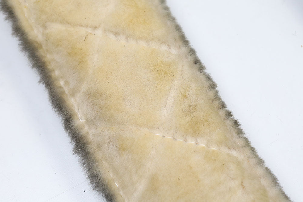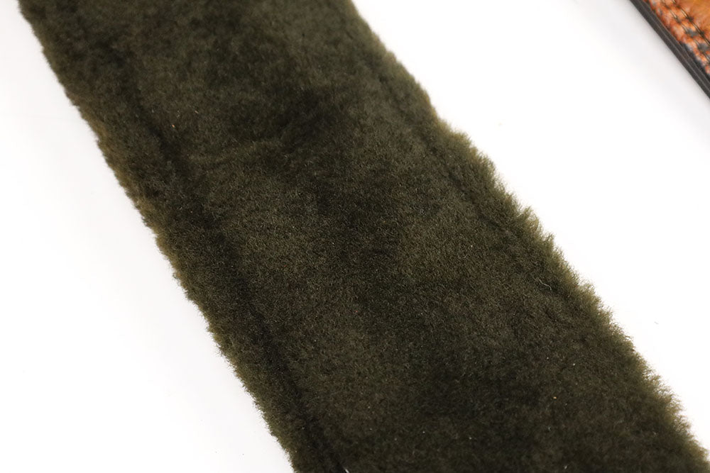 - Bottom options: distressed natural leather, olive green shearling and natural shearling leather